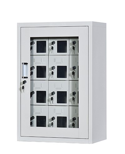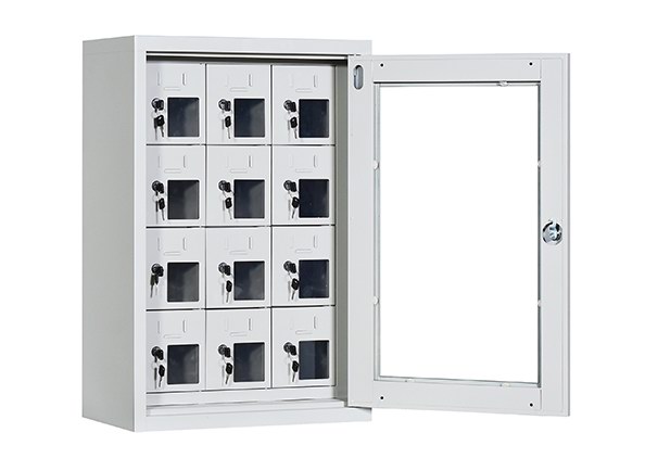手机保密柜正面为对开金属边框玻璃大门,便于观察柜内情况,坚固透亮,美观大方。