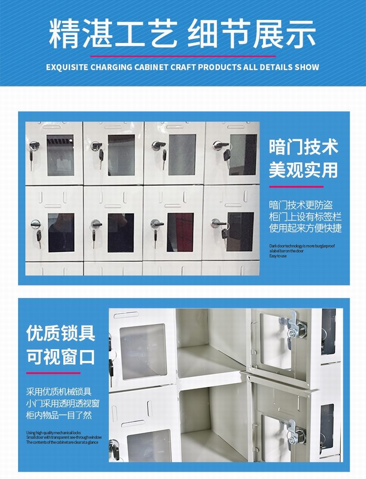 小门设计单独锁具,单柜单开,可实现一人一锁;上方设计标签卡槽,便于粘贴姓名铭牌等信息,方便识别与管理,右下部设计透明亚克力观察窗,便于观察手机存放情况;内部采用暗门折边设计,有效防止刮手。